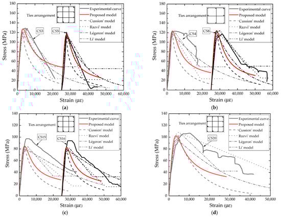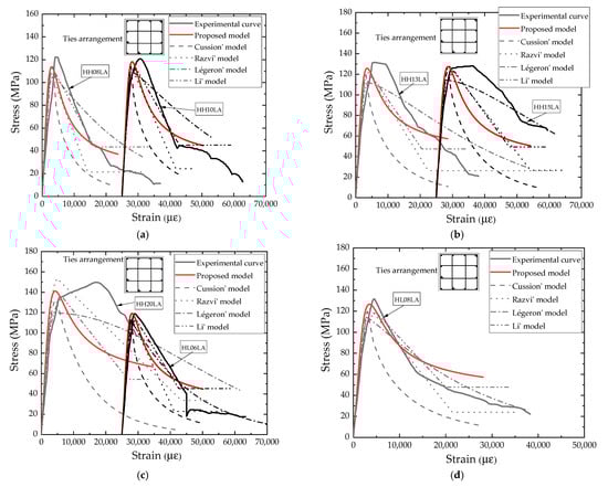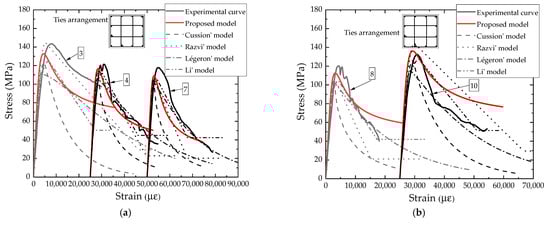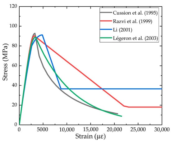 There are currently many ties-confined high-strength concrete stress–strain models. The range of application of concrete strength varies per study, for example, 84–94 MPa for Yong et al. [], 20–160 MPa for Muguruma et al. [], 60–118 MPa for Nagashima et al. [], 52–118 MPa for Cussion et al. [], 45–90 MPa for Bjerkli et al. [], 30–130 MPa for Razvi et al. [], and 20–140 MPa for Légeron et al. []. Currently, Cussion’s, Razvi’s, Li’s, and Légeron’s models are mostly used, as shown in Table 1.