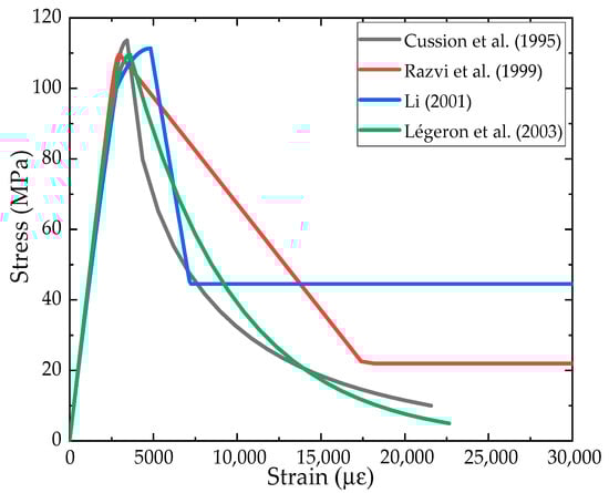 Figure 1 and Figure 2 show that the ascending portion of each model is basically similar, which is mainly because the same ascending portion function is adopted for Cussion’s, Razvi’s, and Légeron’s models. However, the nonlinearity before peak stress in Li’s model is more obvious than that in the other models. For the descending section, the differences among the models are significant; the residual platform value of Li’s model is higher than that of the other models. The descending portion of Razvi’s model is the slowest, and that of Li’s model is the steepest.