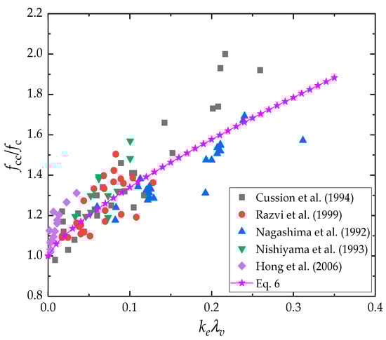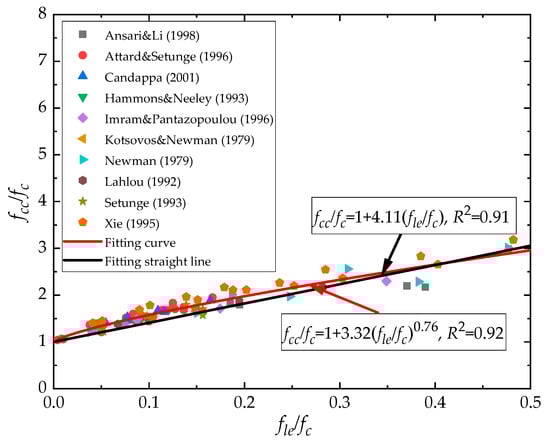 In this study, the relevant experimental data from other studies [,,,] were used to calculate the effective confinement coefficient using Equation (5). The relationship between and was obtained based on the test results of the peak-stress improvement factor and ties characteristic value. The results were compared with the theoretical results of Equation (6), as shown in Figure 8.