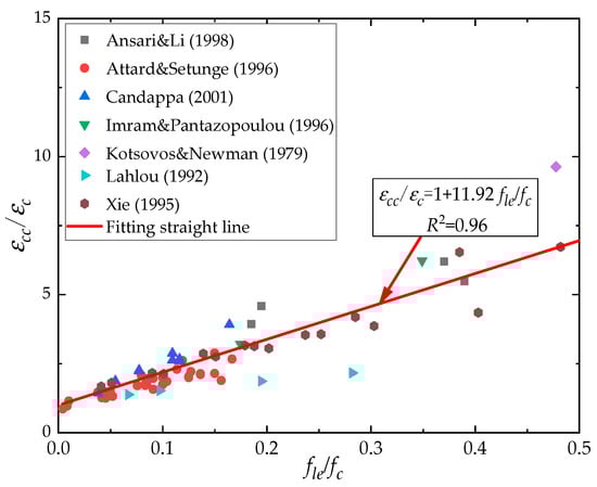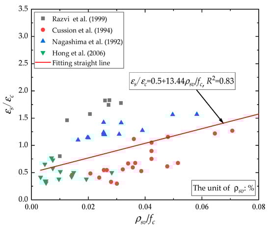 From Equation (12), the ties strain of confined concrete at peak stress is related to and ; it increases with an increase in and . To this end, this study collects experimental data from relevant studies [,,,], as shown in Figure 9.