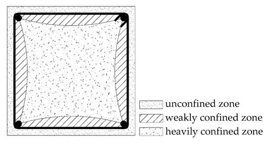 Because rectangular and square columns are common forms in engineering and the lateral confining stress of circular columns can be approximately considered uniform (especially when spiral reinforcements are used), this study mainly focuses on rectangular columns. Rectangular ties sections can be divided into three main regions according to the degree of ties confinement, as shown in Figure 6: