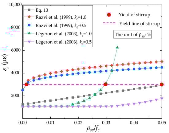 Razvi et al. [] and Légeron et al. [] also proposed empirical formulae for ties strains when confined concrete is at peak stresses based on the experimental results, as shown in Table 2.