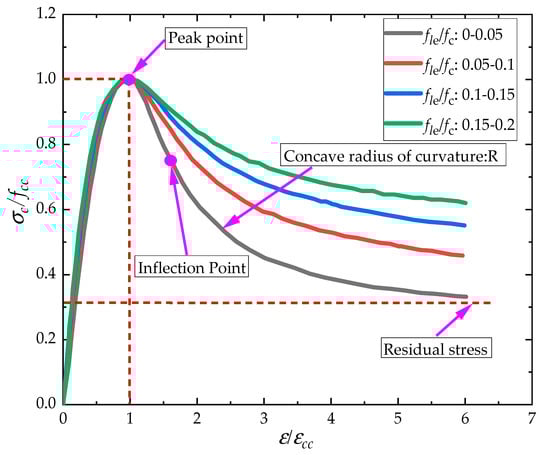 The geometry of the complete curve of the axially compressed stress–strain relationship in confined high-strength concrete is closely related to the degree of lateral confinement. The ascending portion is weakly influenced by the degree of lateral confinement; however, the impact on the descending portion is significant. With an increase in the lateral confinement degree, the concavity of the descending section of the complete curve gradually decreases, and the radius of curvature at the corresponding concave point gradually increases. The complete curve geometry with different lateral confinement ratios is shown in Figure 11. The complete geometric characteristics of the curve of confined high-strength concrete are essentially similar to those of unconfined concrete. However, there is a clearer residual stress plateau in the later part of the full stress–strain curve due to the confined effect.