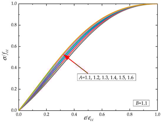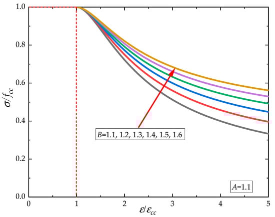 The model parameters control the initial slope and residual stress of the complete curve equation. The effects of A and B on the ascending and descending sections of Equation (14) are shown in Figure 12 and Figure 13, respectively.