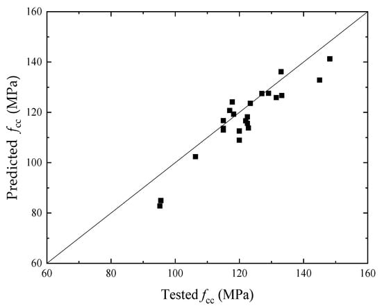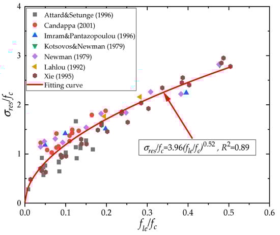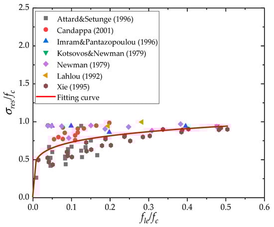 Based on the geometric conditions of the complete curve equation, ; the model parameter B depends on the value of the residual stress in the descending portion, which is mainly related to the concrete strength and lateral confining stresses. In this study, the experimental results of related studies [,,,,,,,,,] were collected to establish the empirical formula of residual stress. Here, the unconfined concrete strength ranges from 60 MPa to 120 MPa, and the lateral confinement ratio is 0–0.5. The relationship between residual stress, concrete strength, and peak strength of confined concrete is shown in Figure 14 and Figure 15.