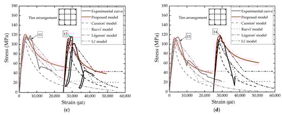 From Figure 10, the ties strain in Razvi’s model increases with an increase in the effective confinement coefficient; however, the rate of increase gradually slows down. The ties strain tends to infinity when increases to a certain value in Légeron’s model. The ties strain predicted by the proposed model is between that of Razvi’s and Légeron’s models, which can better reflect the relationship between ties strain and . When and , it is in general agreement with the results of Candappa et al. [] for Poisson’s ratio tests on high-strength concrete.