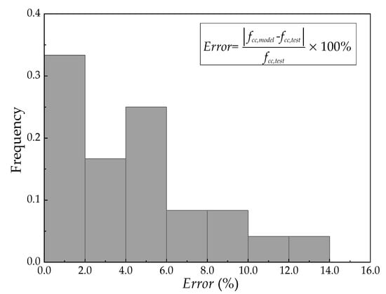 The dispersion of the calculated peak strain was large, which is mainly because the test in Table 3 lacks the test value of the peak concrete strain. Furthermore, the estimation of the peak concrete strain using Equation (21) will result in certain errors. The calculated peak stress was compared with the test results, as shown in Figure 19. The frequency statistics of the relative error between the calculated and tested are shown in Figure 20.