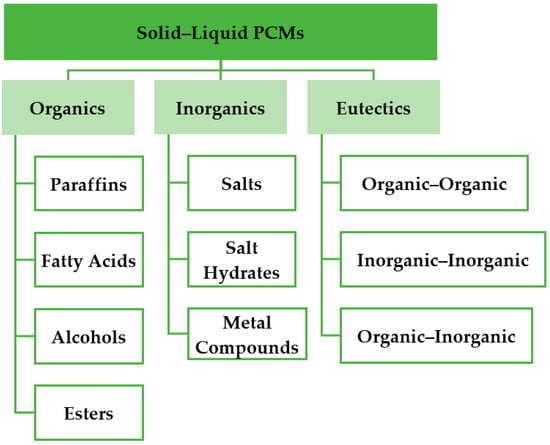 In this context, latent heat storage systems (LHSS) are at the forefront of environmentally friendly solutions for saving energy. They are based on phase change materials (PCMs) which store the heat during an endothermic phase transition and release it throughout an exothermic phase transition. There are four types of phase changes that can occur in an LHSS: solid–liquid, liquid–gas, solid–gas and solid–solid. Among these PCMs, the solid–liquid phase change materials are the most attractive and innovative candidates for thermal energy storage. This is due to their availability in a wide range of temperatures and their high heat storage capacities. The solid–liquid PCMs are classified into three groups: organics, inorganics and eutectics [4,5,6] (Figure 1). They cover a broad range of applications because of the diversity of their melting temperature [7].