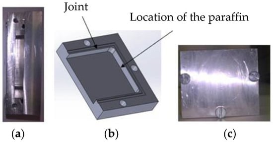 Solid paraffin samples with dimensions of 40–28–4.5 mm3 were prepared in an aluminum mold (Figure 2). This mold was made of two removable parts assembled by the screws, and it was equipped with a joint to prevent the leakage of the liquid paraffin (Figure 2).