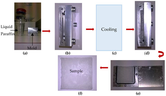(a,b) liquid paraffin in the mold; (c) cooling; (d) solidification; (e,f) the sample; Experimental procedure of the preparation of the solid paraffin sample.