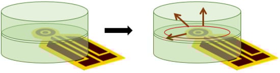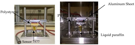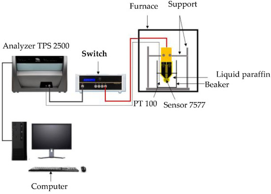 Figure 6 illustrates the experimental procedure of the hot disk method for the characterization of the paraffins in the liquid phase. The 7577 sensor was immersed in 5.216 × 10−5 m3 of the liquid paraffin in a beaker and was is connected to the TPS 2500 analyzer by means of the switch. The measurements were conducted at different temperatures in a furnace. The beaker was closed with polystyrene and covered with aluminum sheet in the furnace to avoid the movement of the liquid paraffin caused by the furnace fan (Figure 7).