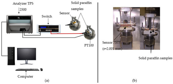 The thermal conductivities and diffusivities of the solid paraffin samples were measured at different temperatures using the experimental setup presented in Figure 5a. A 7577 sensor with a radius of 2001 mm was sandwiched between two identical samples (Figure 5a,b). This sensor was connected to a switch that is linked to the analyzer (Hot Disk TPS 2500). A PT100 temperature sensor, connected to the analyzer, measured the sample temperature. The applied heating power and the measurement time were 20 mW and 40 s, respectively. The measurements were performed at least three times to ensure repeatability. The overall result at each temperature was the average of the repeated measurements. Standard deviations were calculated to evaluate the uncertainties of the average thermal conductivities and diffusivities.