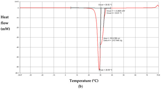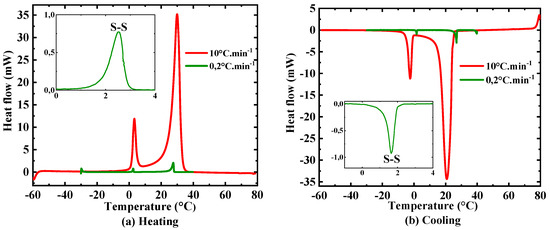 Furthermore, Figure 8, Figure 9 and Figure 10 highlight the effect of the heating and cooling rate on the amplitudes and widths of the thermogram peaks. In fact, the results show that the peaks of the thermograms obtained from heating and cooling at 10 °C.min−1 are higher than those of measurements at 0.2 °C.min−1. Figure 8, Figure 9 and Figure 10 reveal also that the width of the thermograms increases at a greater heating–cooling rate. These results are due to the thermal inertia of the samples [49,50]. In fact, the DSC measurements at a heating–cooling rate of 10 °C.min−1 overestimate the phase change interval because of the non-thermal equilibrium in the sample. A thermal equilibrium is reached at heating–cooling rates less than 0.5 °C.min−1 [49,51].