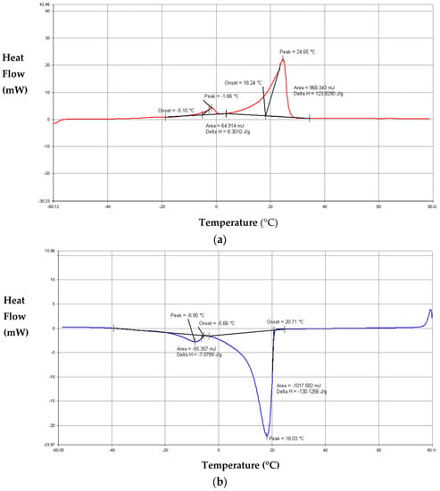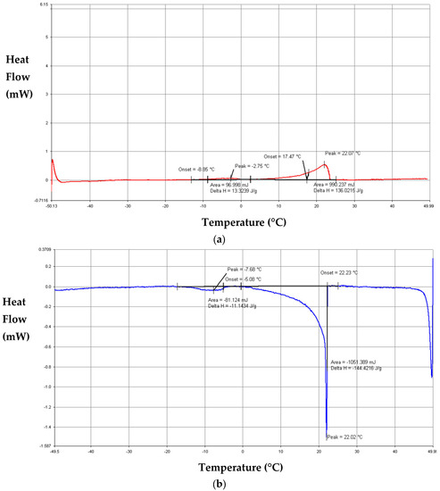 Analysis of thermograms of RT50 during (a) heating and (b) cooling at 10 °C.min−1.