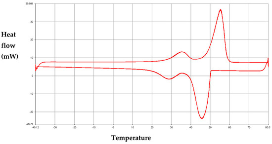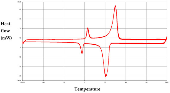 DSC measurements were performed using a power compensation calorimeter [38,39] (Diamond Perkin Elmer, Waltham, MA, USA) equipped with the Pyris software 13.3.2 for thermal data analysis. The temperature and power accuracies of this calorimeter are 0.1 °C and 1%, respectively. The measurements were carried out at heating–cooling rates of 10 °C.min−1 and 0.2 °C.min−1 under a constant nitrogen rate. Indium (TS-L = 156.6 °C, ∆HS-L = 28.61 J.g−1) and distilled water (TS-L = 0 °C) were used as standard materials for the temperature and the enthalpy calibration of the calorimeter.