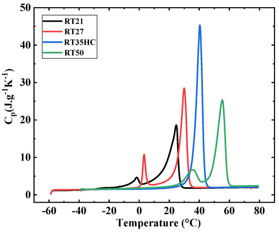 It can be inferred also from the DSC thermograms that paraffin RT35HC does not present a solid–solid transition during the heating and cooling process. This result indicates that RT35HC is made of n-alkanes CnH2n+2 with n below 15 or even between 16 and 20 [53].