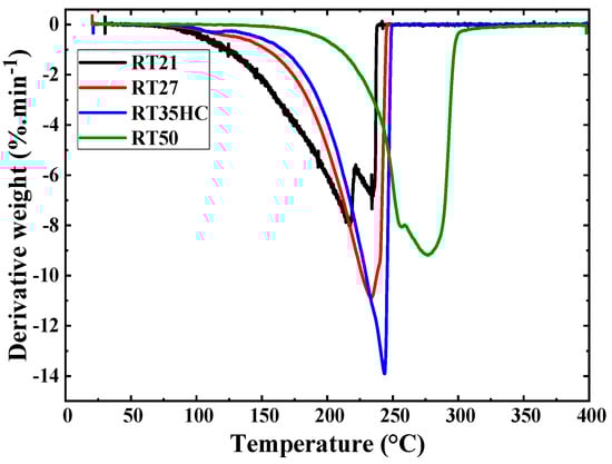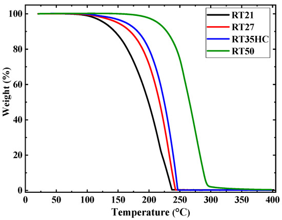 The thermal degradation of the paraffin waxes was assessed using a TGA 4000 (Perkin Elmer, Waltham, MA, USA) at a temperature range of 20 °C to 400 °C at a heating rate of 5 °C.min−1 under nitrogen atmosphere. The mass and the temperature accuracies of this apparatus are 0.02% and 1 °C, respectively [40]. The weight of the samples varied between 10.000 (0.0020) mg and 20.0000 (0.0040) mg. The first aim of conducting the TGA measurements was to study the thermal stability of the paraffins. Their second goal was to determine the temperature of the degradation of each paraffin for safety reasons. The evolutions of the derivative weights with temperature were also studied to investigate the kinetics of the degradation of the paraffin waxes.