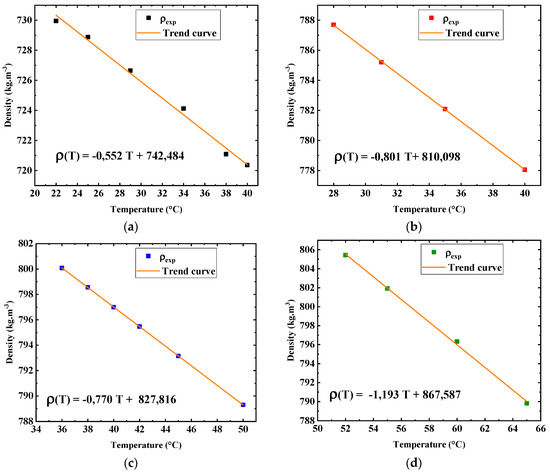 The measurements of the density of a paraffin in the liquid state were performed using the following experimental procedure: First, the mass of the empty and dry pycnometer m0 is weighed. Then, a volume of water VH2O is poured into the pycnometer up to the stopper (Equation (6)). m1 indicates the mass of the pycnometer filled with distilled water. Afterward, the dry and empty pycnometer is filled with the liquid paraffin up to the stopper. The mass of the pycnometer filled with paraffin, m2, is measured. Hence, the density of the liquid paraffin is given by Equation (7). The measurements of the density in the liquid phase are performed at different temperatures in a furnace.
