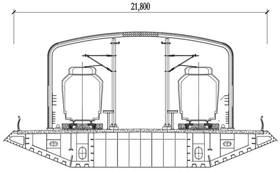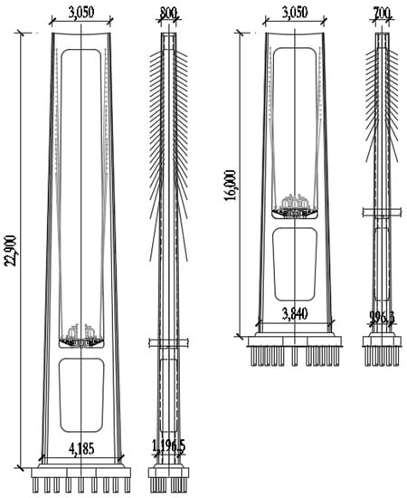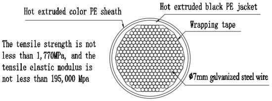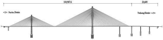 The Nanjimen Yangtze River Track Special Bridge connects Yuzhong District and Nan’an District and is an important link in the second phase project of Chongqing Rail Transit Line 10. The main bridge is a five-span double-cable plane and high-low tower cable-stayed bridge with a semi-floating system. The span arrangement of the main bridge is 34.5 + 180.5 + 480 + 215.5 + 94.5 m. The main girder is a SCCB, and the portal tower form is used. The bridge type layout, cross-section view of the main beam, the main tower, and the cable are shown in Figure 1, Figure 2, Figure 3 and Figure 4, respectively.