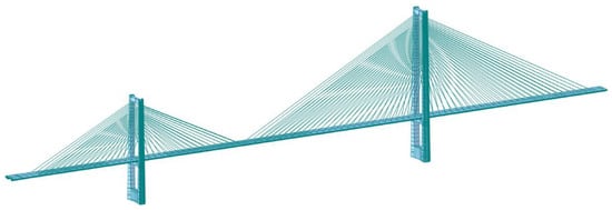 MIDAS/Civil was used to carry out the FE numerical analysis model of the Nanjimen Yangtze River Track Special Bridge (Figure 5). The model used beam elements to simulate the main tower, pier, and main beam, and truss elements to simulate the cables. The boundary conditions of the model included complete consolidation between the main tower and the pier, a rigid connection between the main tower and the stay cable, and tri-directional restraint at the boundary of the auxiliary pier. In this model, the shrinkage and creep of concrete were considered, and the material properties given in the design drawings were used. At the same time, according to the “Code for Design of Railway Bridges and culverts” (TB10002-2017) issued by the National Railway Administration, the time-dependent characteristics were considered, and the software was used to automatically calculate the most adverse effects of shrinkage and creep loads.