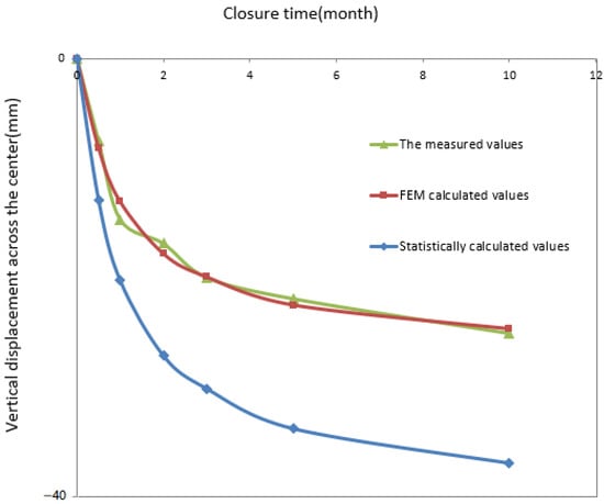 To verify the applicability of the method, the measured values, FEM calculated values and statistically calculated values (calculated by the MC-RSM method) of the vertical deformation data since closure of the main span were compared and analyzed. The measured deformation data was obtained from the health monitoring system (HMS) of Nanjimen Yangtze River Track Special Bridge. Using phase shift regression analysis, an empirical regression equation [,] was established to exclude the influence of temperature effects, and then compared with the calculation results. The results are shown in Figure 6.