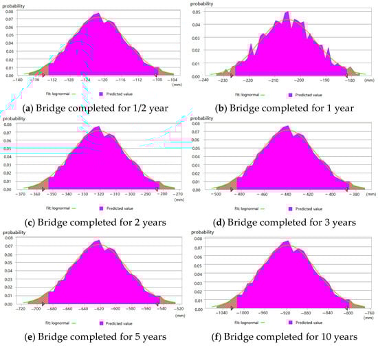 When predicting deformation at the mid-span of the main span, the MC method was applied, selecting a sample number of 10,000. The shrinkage and creep of the Nanjimen Yangtze River Track Special Bridge were analyzed randomly based on the variability of the material parameters. The average value and standard deviation of vertical deformation at the mid-span of the main span were analyzed by selecting six time nodes from 1/2 year to 10 years after bridge completion. The results are shown in Table 5.