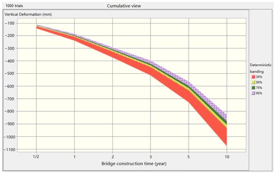 The vertical deformation predicted interval at each chosen time node for different random factors was plotted for these five different confidence levels. Figure 8 shows the results for the vertical deformation of different deformation intervals in 10 years.