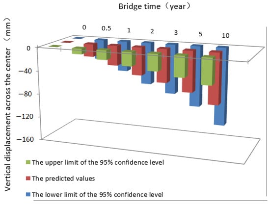 Furthermore, the predicted values obtained by the FE calculation were compared with the confidence interval at the 95% confidence level. The predicted values for vertical deformation at the mid-span of the main span were obtained using MIDAS/Civil considering different time nodes after bridge completion. Under the same random parameters, the confidence intervals at the 95% confidence level were obtained by the MC method sampling, and the comparison results are shown in Figure 9.