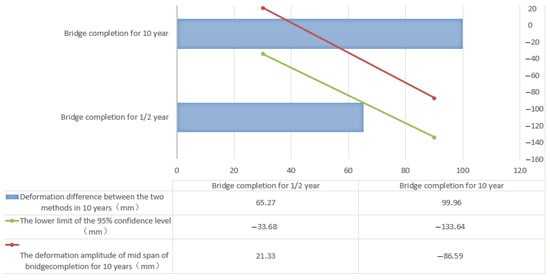 Figure 9 illustrates that the predicted values obtained by the proposed model fall within the 95% confidence interval, demonstrating the high accuracy of the parameter distribution and analysis method. The 10-year deformation amplitude of the bridge calculated by the finite element software and the variation value of the lower limit of 95% confidence level are shown in Figure 10. It can be seen that the 10-year deformation interval calculated by the finite element software is (−86.5963, −21.3299) mm, and the variation value is 65.2664 mm. Using the uncertainty analysis method of MC-RSM, the variation interval of the lower limit of the 95% confidence level is (−133.64, −33.68) mm, and the variation amplitude of the lower limit of the 95% confidence level is 99.96 mm. The deformation difference between the two methods increased from 12.35 mm at half a year to 47.04 mm at 10 years. The deformation amplitude of the mid-span of the bridge at 10 years after completion (calculated by the FE method) and the lower limit of the 95% confidence level (predicted by the MC-RSM method) and the deformation difference obtained by the two methods in 10 years are shown in Figure 10. The vertical deformation at the mid-span of the main span is relatively discrete, resulting in small calculation values by the FE method, which is due to the influence of parameter randomness. It can be concluded that environmental factors, material factors, and other factors should be considered comprehensively when analyzing the alignment of large-span track SCCB cable-stayed bridges.