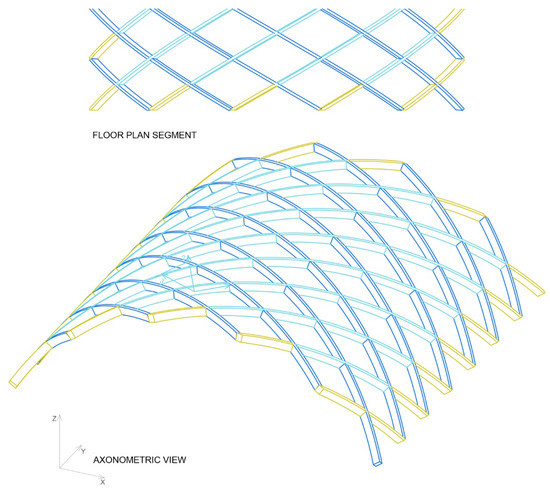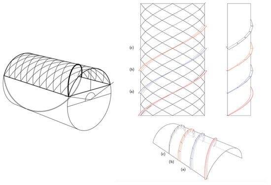 A diamond pattern of lamellae has usually been applied to vaults and domes. The geometry of the vault is a cylindrical surface with different primary curves: (1) circular segment, (2) parabola, and (3) funicular curve [1]. For a circular cylinder surface, all the lamellae and their joints are uniform; the geometry of each lamella is the same, as its radius of curvature and length. The only difference between the lamellae is caused by their position in the structure, so the edges of the lamellae are cut differently. Other cylindrical surfaces have self-similar lamellae sets; every group of lamellae has the same characteristics as the previous but is scaled in length. The same goes for spherical and elliptical domes.