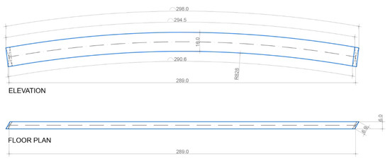 The shape of one lamella in floor plan and elevation, with an arched shaped axis. This drawing presents one typical lamella for a timber lamella vault, where all the axes of the lamellae intersect and the lamella axis is a planar arch.