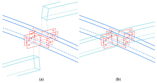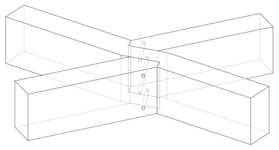 A modification of the original joint was presented in the book by Müller [25]. The space between connecting lamellae is lost, and additional steel plates and bolts are placed to join the three lamellae in the node. This type of joint is not seen in other literature and is not explained in this book either. As presented in Figure 6, it can be concluded that the axes of the lamellae intersect in the node and that there is no eccentricity, making this joint an improvement on Zollinger’s joint. On the other hand, the geometry of the lamella structure has to be changed for this node to be applied. Figure 2a,b show a possible solution for the torsion of the lamellae needed to allow the axes to follow the helix curve on the circular cylinder surface. This type of joint would have to be modified for vaulted lamella structures.