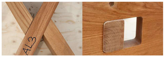 Another wood joint for the lamella structure can be seen in an example from Great Britain, constructed in 2019: a Wiltshire family home by Bath Bespoke. The diamond pattern was applied to a simple pitched roof, and the lamella joint was built without steel elements as a traditional mortise and tenon joint. The middle of each lamella was cut in a rectangular shape, to place the connecting lamellae through the opening, as shown in Figure 8 [27]. This type of joint is simple and efficient, but only for flat surfaces. The question remains if it could be applied to curved surfaces. The design authors emphasized that the joint needed to be precisely constructed, so the modules were built in a workshop and then transferred to the site to be assembled in place [27]. There must not be any gap between the lamellae for this joint to work, because all forces are transferred along the perimeter of the mortise. This type of wood joint follows the contemporary aspiration for a green, no-carbon future, but they require further development to be used commercially. Experiments regarding carpentry joints are being carried out, to examine their bearing stiffness and to propose their use in contemporary structures [28]. The presented joints are strengthened with screws/dowels, but to be sustainable, they should be designed as Japanese wood joints [29].