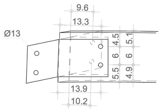 The dominant forces in the timber lamella vault are axial forces. The maximum resultant force in the joint from the finite element model was R = 17.59 kN, so it was concluded that the designed connection was suitable for the prototype. The dimensions of the steel plates and the position of the bolt holes are presented in Figure 13.
