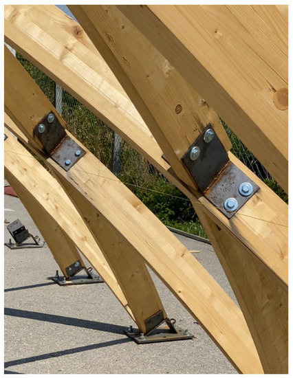 The designed joint was applied to the prototype of a timber lamella structure. During the assembly, the previous conclusions about lamella structures were analyzed. The advantages of historical lamella structures are the uniformity of the elements, the ease of assembly, and the economic structure. The chosen lamella and joint design for the prototype confirmed all these advantages. All lamella axes were the same length, except the ones on the perimeter, which were half the length. There were six types of lamellae and corresponding joints, because of the different cuts at the ends of the lamellae depending on their position in the structure, confirming that the timber lamella structure had uniform elements. The amount of time needed for shaping and mounting the lamellae was short, and the whole structure was built in less than a week, with only three workers [13]. There was no need for scaffolding. In the beginning, simple supports had to be placed, but immediately after placing several lamellae, they could stand independently. Every additional lamella reinforced the previous one and set its position in the structure. The production of elements and the structure assembly confirmed the ease and economy of construction. Figure 14 shows a prototype segment, where the joints can be seen.