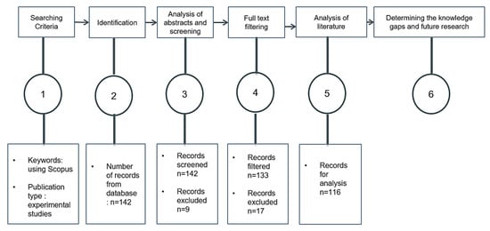 This paper is a literature review that displays an overview of the physical, mechanical, and transfer properties that occur at the steel-concrete interface. A systematic process was followed in order to identify relevant papers that are related to the topic. Using the Scopus database, keywords were searched to find related studies. The total number of collected research papers or records were 142, these records were screened to ensure that experimental studies related to the influence of mechanical loading on the steel-concrete interface and permeability/transfer of gas within this interface were included. After carefully reading the abstract of each of the 142 articles, unrelated records were removed. Hence, the total number of excluded articles related to corrosion effect was nine, which will not be addressed in this review. The remaining papers were assessed after reading the whole article, and another 17 papers were excluded. The total records remaining (116) were the total final studies included for the literature review (Figure 1).