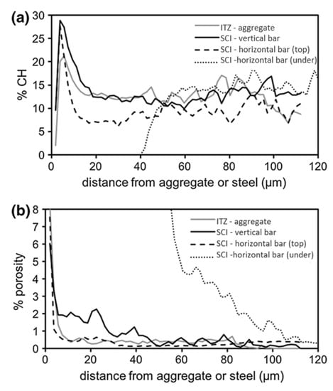 At the ITZ and SCI, (a) calcium hydroxide (CH) and (b) porosity percentage between steel rebar (9 mm) and cement. Duration 1-year w/c = 0.49 [].