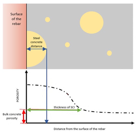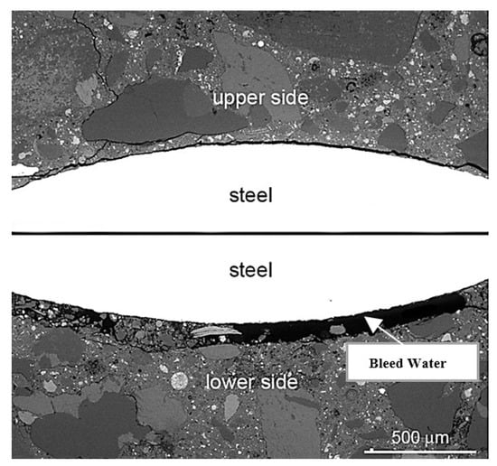 At the SCI, air voids play a major physical role between the steel–fresh concrete and steel-void connection. The flowing direction of concrete during placement contributes to the extent to which it is compatible with the reinforcing rebar. Consequently, voids will form because less coarse aggregates and fresh concrete will reach the reinforcing steel bar []. In saturated concrete, the horizontal bar and bulk concrete influence the void size, which is around 100 mm []. The change in the microstructure will be due to the restrained drying shrinkage []. Angst [] observed the voids using backscattered electron micrograph and the results have shown that bleed water zones under the rebar were approximately 200 μm, as shown in Figure 4. At the SCI, bleed water will gather under the steel rebar that can later be removed using shrinkage chemical admixtures. These voids are filled with water, so they are not entrapped air voids.