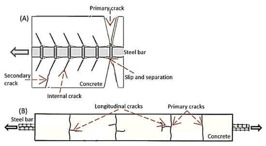 Detailed representation of (A) concrete cracking (primary, secondary, internal concrete cracking) and (B) primary then longitudinal cracking due to tensile stresses (Reproduced with permission from reference []).