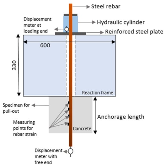 Improvements in the steel pull-out resistance can be achieved by managing the development of cracks due to the material properties. In the pull-out system shown in Figure 6, the specimens under study include ribbed reinforcing steel of different diameters of 16 mm and 20 mm and smooth steel of 8 mm with a variation in the C30 and C50 strength grades of concrete, in addition to two different anchorage lengths of 200 and 300 mm. The specimens were loaded at different increments, first at 2 to 5 kN and then at 5 to 10 kN. The displacement was then recorded [].