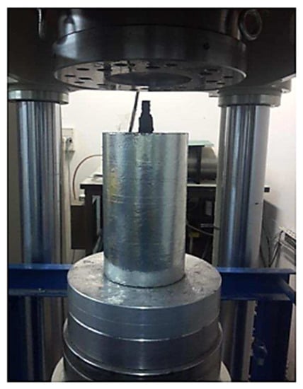 The push-in test was conducted on steel reinforced cylindrical specimen G1 to evaluate the displacement of the top steel rebar, i.e., ribbed under applied load as shown in Figure 7 []. The type of failure that must occur within the specimen is required to be shear failure at the SCI, as per the chosen specimen configuration. Percolating gas, such as nitrogen, under pressure gradients across the specimen in the longitudinal direction is used to assess gas conductivity []. The specimen had a compressive strength of 28 MPa and was reinforced with a 16 mm diameter steel rebar. The anchorage length was within the interface and was set to be 7 cm according to Tixier to reach a shear failure at the SCI [].