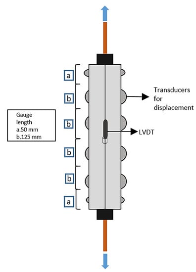 Tie beam testing was conducted on normal strength concrete (NSC) and fiber reinforced concrete (FRC) [,]. A steel rebar of 11 mm diameter and supporting concrete in an RC structure subjected to tensile stresses comprise the tie specimen, as shown in Figure 8. The cross section of the sample is 90 mm × 90 mm with a thickness cover of 40 mm. The displacement rate is set to 0.05 mm/min. The structure assures that only the tie-specimen experiences yielding of the rebar. The placement of gauges is to measure the strain.