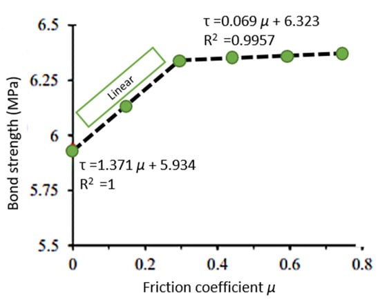 The friction in bond stress cannot be evaluated for concrete and ribbed steel, so the impact of friction coefficient μ was studied between the concrete and steel rebar. Mengjia et al. [] found that the bond strength increased linearly with the increase in friction coefficient, but after a certain value for friction coefficient of 0.3, the bond strength was constant (Figure 9). Hence, no additional damage has occurred at the interface. This result can be explained by the fact that the concrete crushing occurred before the compressive strength of concrete was achieved [].