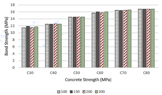 The strength grade of concrete is influenced by the mix proportions of cement, water, sand, and aggregates. An increase in bond strength in Figure 10 was observed for the different specimens; this increase was dependent on the higher concrete compressive strengths. The higher the strength grade of the concrete, the stronger the bond will be between the concrete and reinforcement, since the homogenous structure of concrete provides a better surface area for the reinforcement to adhere to [,]. Therefore, the strength grade of concrete must be carefully considered in the design of reinforced concrete structures to ensure that the bond strength between the concrete and reinforcement is sufficient to withstand the anticipated loads and stresses. The anchorage length had no effect in this case. Moreover, the mode of failure changed from pull-out of steel bar to tensile failure with the increase in concrete strength [].