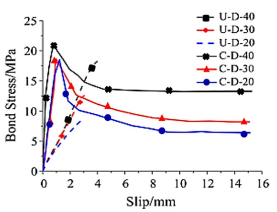 Bond–slip behavior of the different steel rebars. (U or C) for unconfined or confined, (D) for deformed bar, (20, 30, 40) for concrete strength grade (Adapted with permission from reference []).
