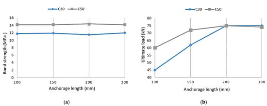The anchorage length is defined as the reinforcing steel rebar length embedded in concrete. The anchorage length is almost equal to the length of the rebar and has different values depending on the study. There is a direct relationship between the anchorage length and the pull-out resistance at the SCI. In Figure 12a, the bond strength did not vary with the increase in anchorage length from 100 to 300 mm; therefore, no effect on the bond strength has been recorded. Figure 12b shows that for anchorage lengths varying from 100 to 200 mm, the ultimate load increased until it reached a maximum of 75 kN. The increase in ultimate load was recorded by 64.2% for 200 mm of anchorage length compared to specimens with 100 mm of anchorage length. Beyond that, the ultimate load remained constant with the increase in anchorage length. For shorter anchorage lengths, the ultimate load increased with the increase in anchorage length, and the failure mode shifted from pull-out failure into tensile failure of the specimen [].