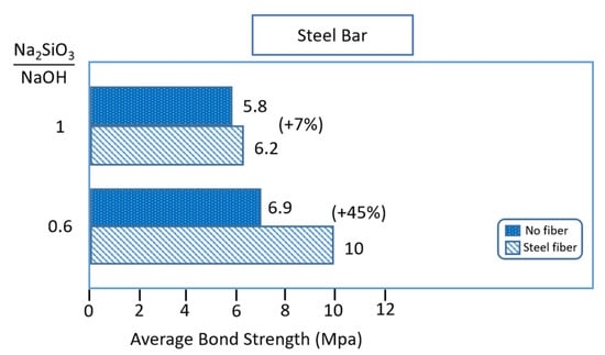 Albidah et al. [] studied the effect of steel fibers on the bond strength of geopolymer concrete with and without steel fibers, and different sodium silicate to sodium hydroxide ratios of 0.6 and 1. Two modes of failure were established for geopolymer concrete specimens reinforced with steel fibers (0.5 mm in diameter and 30 mm long) and embedded with ribbed steel rebar of 12 mm diameter: splitting of the concrete and rebar pull-out. The fiber reinforced specimen with Na2SiO3 to NaOH ratio of 0.6 failed by pull-out of the rebar, whereas the steel fiber reinforced specimen with ratio of 1 failed with the concrete splitting with a bond strength of 6.2 MPa. Figure 13 presents the average bond strength for the plain and 200 mm fiber-reinforced geopolymer concrete cube with embedded steel rebar, and bonded length of rebar as 5d (five times the diameter of the rebar). It can be observed that the addition of steel fibers into the geopolymer concrete mix enhanced the bond strength at the SCI. The percentage increase in average bond strength varied from 7% to 45%. In particular, the inclusion of steel fibers changed the failure mode from concrete splitting to bar pull-out. The difference in the failure modes is due rather to the steel fiber’s high splitting tensile strength in the geopolymer concrete matrix in comparison to plain concrete, which also leads to higher average bond strength. The mechanical resistance of reinforced concrete with concrete mixes of different binder types and under pull-out testing is summarized in Table 3.