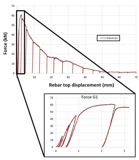 The push-in test [] was conducted for ribbed steel-reinforced concrete specimen G1 with an anchorage length of 7 cm to study the shear performance and transfer properties at the SCI. This anchorage length is considered to be short compared to the total length of the specimen. The steel at the ends is free of displacement and the only reason that limits the sliding of the rebar is the 7 cm bond with the concrete. The specimen configuration was set so that only shear failure will occur at the SCI. For larger anchorage lengths, the failure would occur due to splitting of concrete along the length of the specimen. According to the push-in test, at the pre-peak phase, for smaller displacement values there is a contribution of chemical adhesion. Then, upon the increase in the applied loading (at the top part of the ribbed steel rebar) the displacement increased, and mechanical interlocking took place. Hence, shear stresses are transmitted through the interface and local sliding of the rebar occurs. In this phase, a linear behavior is observed. At the peak load, the interface cannot withstand the transmitted shear stresses and failure occurs. In Figure 14, the maximum force and displacement recorded for specimen G1 were approximately 62 kN and 2.7 mm, respectively []. In the post-peak phase, the steel-concrete interface was not capable of transmitting additional stresses, which indicates the decrease in load. In this case, friction forces dominate with the global sliding of the rebar. After that, for larger displacement values beyond 52 mm, the friction force diminishes till reaching nearly 0 kN (no interface).