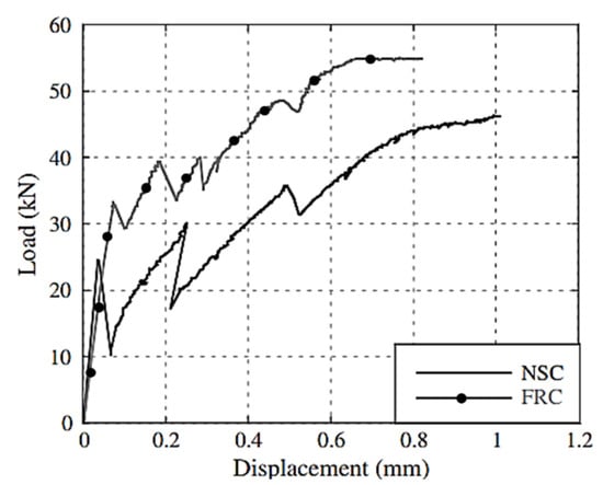 The tie-beam testing conducted on fiber reinforced concrete (FRC) and normal strength concrete (NSC) tie specimens is studied for mechanical properties under static loading. Figure 15 shows the load–displacement curves for the different tie specimens. The specimens showed similar mechanical behavior compared to each other; however, for the FRC, the sudden drop of force was observed to be less than that of the NSC in Figure 15. The higher forces prior to reaching the yielding of the rebar were due to the high contribution of the concrete reinforced with fiber to the total tensile strength [,].