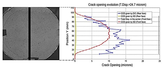 Tensile testing in a tie-beam setup was conducted on normal strength reinforced concrete (NSC) and the results of the evolution of the applied tensile force versus the end displacement of the steel rebar in the longitudinal direction are presented in Figure 15 []. In the elastic (linear) phase and for loads starting from 0 to 15 kN, micro-cracks did not appear. Upon the increase in loading, between 15 and 25 kN, a non-linear behavior can be observed, and micro-cracks are initiated and propagated in the concrete. Moreover, there was a local development of macro-cracks with a further increase in loading in the loading phase for forces varying from 25 to 45 kN. Furthermore, it can be noted that both the macro- and micro-cracks propagated in a direction perpendicular to the direction of the applied loading. The abrupt drop in the load is explained by the fact that a localized macro-crack has developed in the tie beam specimen. The rate of the drop has decreased compared to when the first crack appeared. In the zone of loads 45 to 47 kN, the reinforcing bar is undergoing plastic behavior. Overall, from the load displacement curve in Figure 15, three macro-cracks can be observed for the normal strength concrete (NSC) tie specimen [].